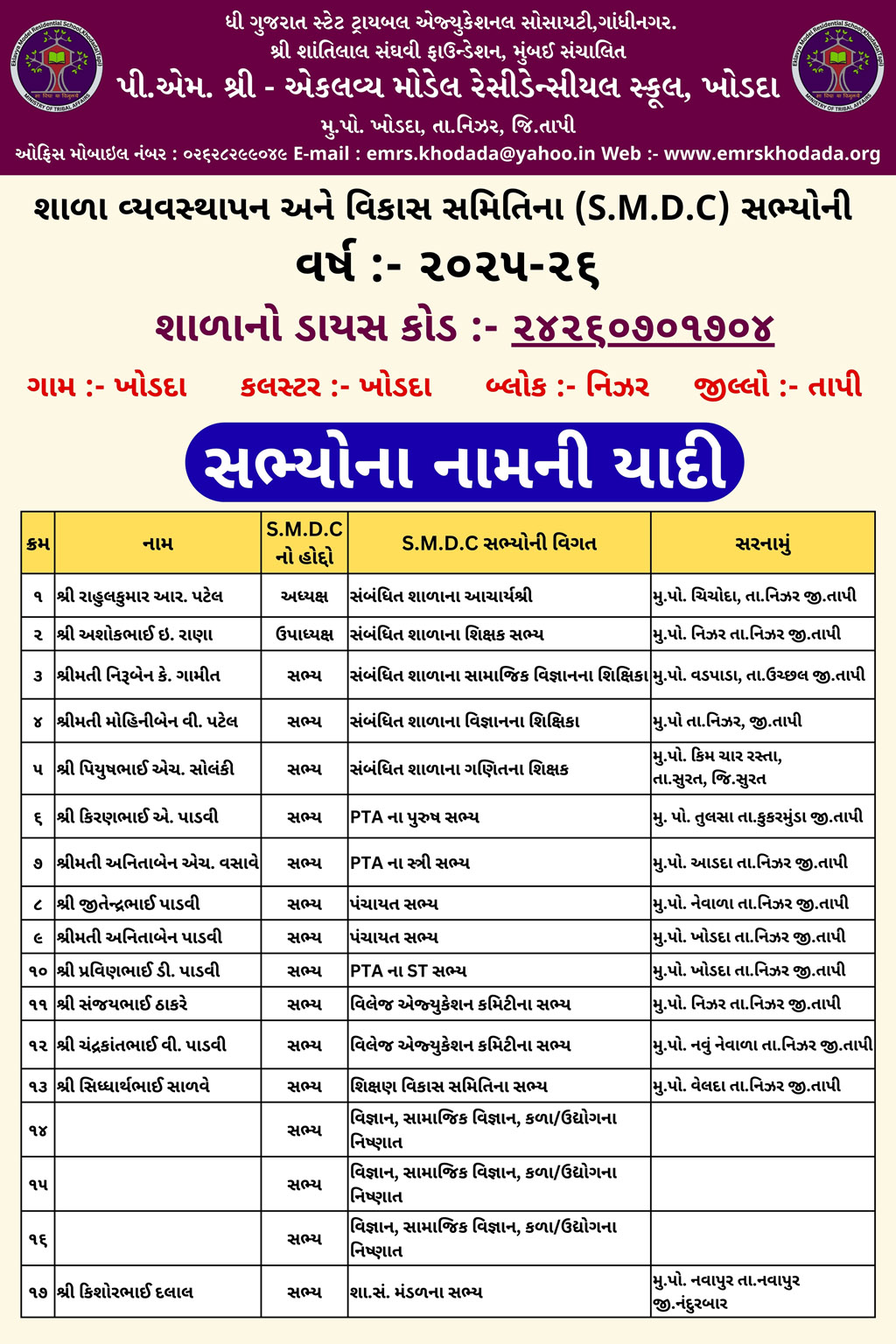 Eklavya Model Residential School Khodada, Taluka Nizar is managed by Mumbai based reputed Shantilal Shagavi Foundation from August 2009 under the dynamic leadership of S.S.F Chairman, Shri Sudhirbhai V. Valia. E.M.R.S. School has achieved many accomplishment after take over of school management of E.M.R.S. Khodada under the public private partnership policy of tribal dept. The school has achieved 100% results in S.S.C & 80% result in S.S.C. & H.S.C. in science & general stream for the academic year 2015-16. At present school is guided by Shri Anilbhai Kamdar, Kishorbhai Dalal & Rajeshbhai Chitalia from the management side.
